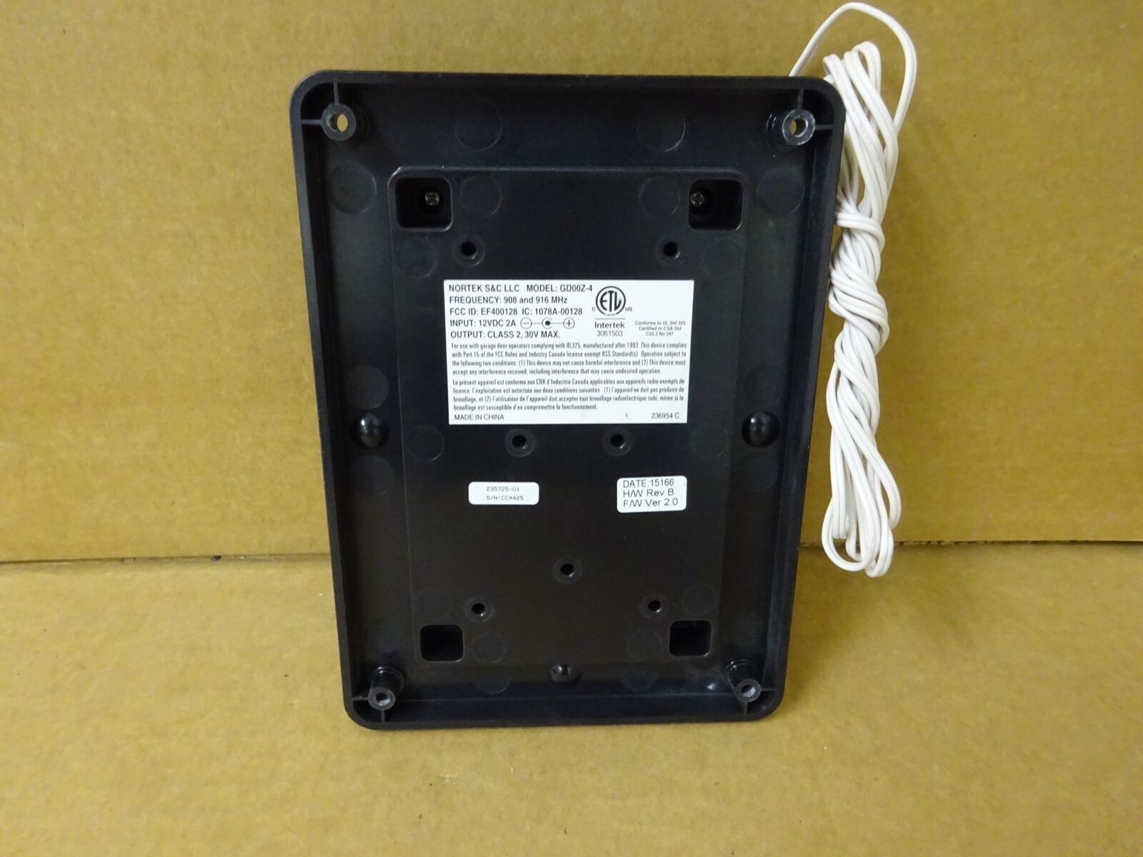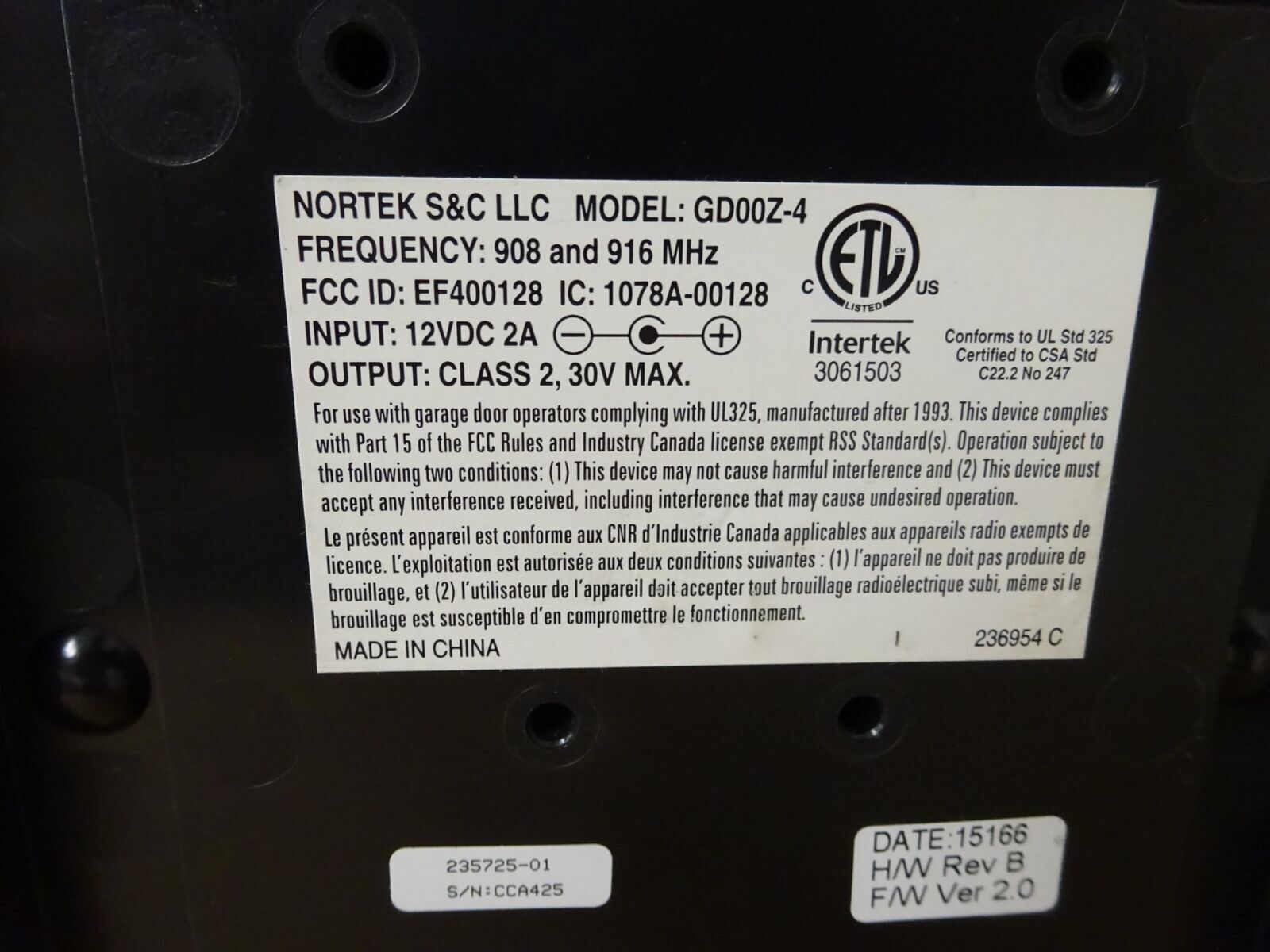 Garage door position sensor frequency: 345 MHz, Z-Wave Frequency: 908.42 MHz
